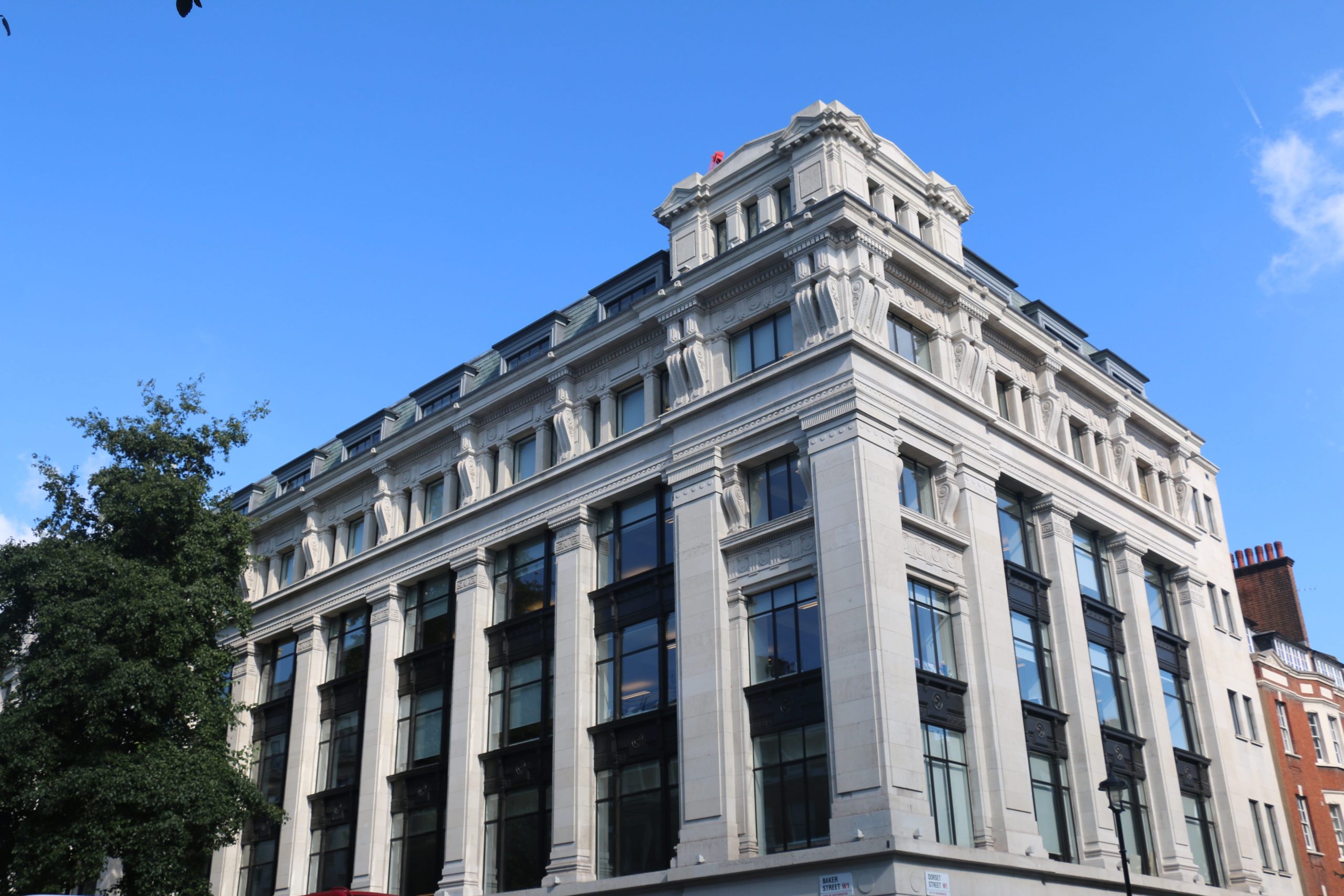 All the original Crittall windows at 82, Baker Street were replaced with new double glazed thermally and acoustically enhanced Crittall windows of the same profiles. The colour of the windows and panels was carefully chosen to re-emphasise the hierarchy and verticality of the original façade, and its magnificent Portland Stone pilasters.