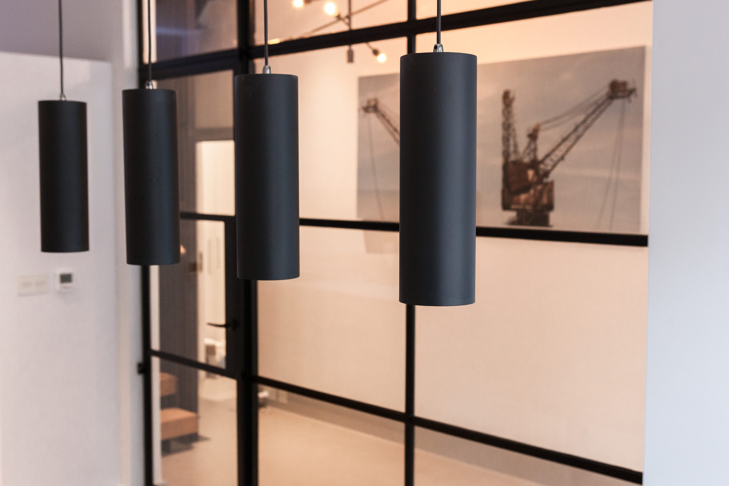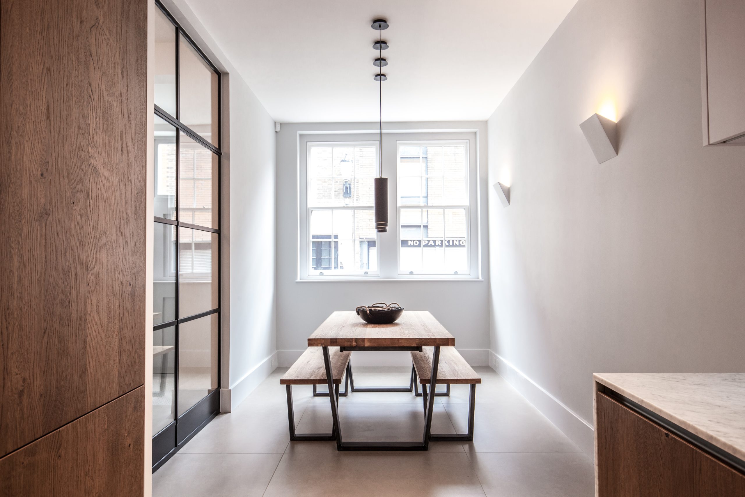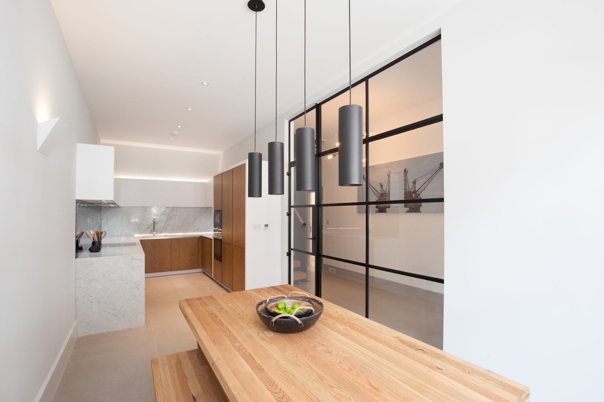 Crittalls Innervision range, featuring 15mm fire rated glazing, is the main focus of the interiors works, transforming this previously unused dark garage area allowing natural light to flood into the kitchen and entrance hallway. The clients tasteful industrial décor style perfectly complements the statement Crittall black (RAL9005) door screen.