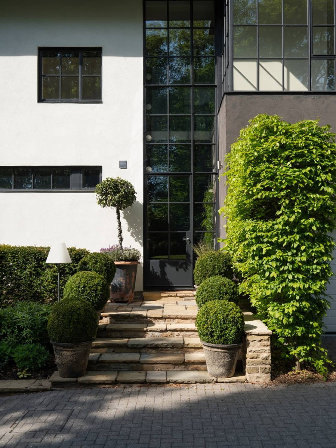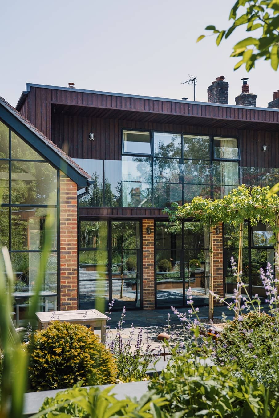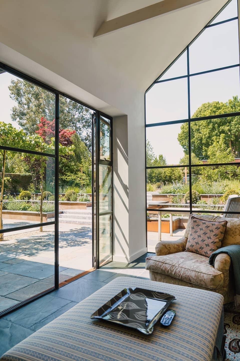 The steel glazing feels entirely at home within the contemporary architecture, enhancing its form without overpowering it.